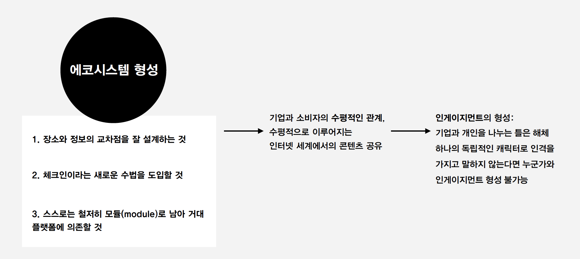 전후 사회에서는 매스미디어를 통해 소비 관련 정보를 얻고 자신을 패키지화했으나, 이제는 정보가 세분화된 비오톱으로 흐르게됨으로써 소비를 통해 사람과 사람이 이어지기 위한 공간과 권역을 만드는 그런 콘텐츠를 형성해야 합니다.