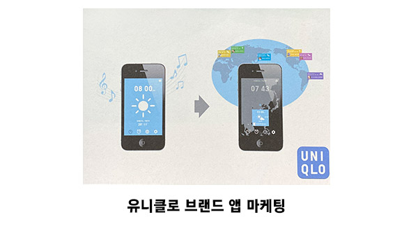 두 번째는 SPA 브랜드 유니클로의 브랜드 앱 마케팅입니다. 옷과는 전혀 상관없는 캘린더, 알람 서비스, 레시피 등의 앱을 제작해 브랜드 가치를 전달하는 방법이었는데요, 언뜻 보면 옷과는 직접적인 관계가 없는 듯 보이지만 우리 일상의 단순한 것들, 당연한 것들 속에 스며들어 ‘정든 브랜드’의 위상을 확보한다는 전략이라고 합니다. 이걸 보고는 브랜드를 전개하는 방법에는 한계가 없는 것 같다고 생각했어요. 가장 익숙한 것에 스며드는 방법이라니! 일상생활에서 느꼈다면 조금 감성적인데? 하고 느꼈을 텐데 이렇게 철저하게 설계된 브랜드 디자인의 방법이라는 생각을 하니까 조금 싫어지네요
