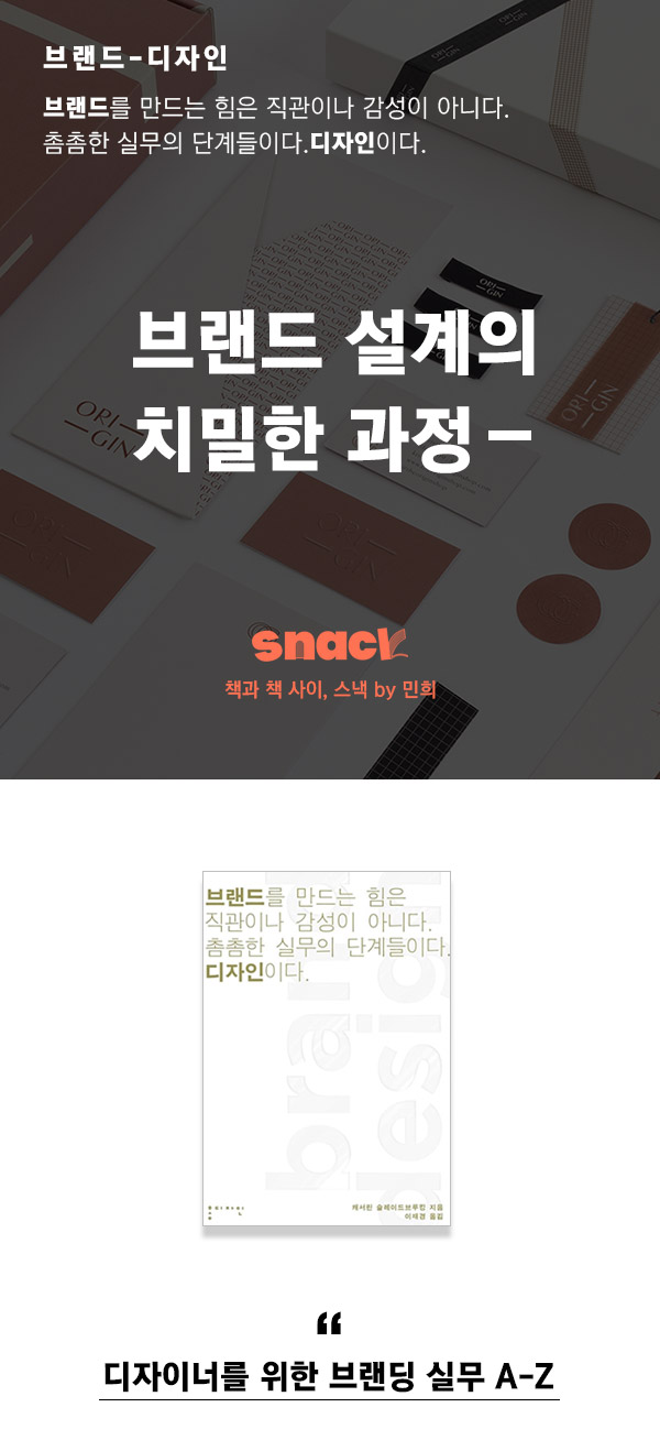 브랜딩에 대한 책을 고르려고 진열대를 보고 있었어요. 단순히 커버 디자인이 제 맘에 쏙 들어서 이 책을 고를 때는 미처 생각하지 못했죠. 이렇게 교과서 같은 책일 거라고는 ... 두께부터 심상치 않았던 이 책은, 목차를 확인할 때부터 마지막 장을 넘길 때까지 어떻게 리뷰를 써야 할지에 대해서 계속 고민을 하게 하더라고요. 제목처럼 브랜드 디자인에 대해 직관이나 감성, 느낌이 아니라 자세한 실무의 단계를 여러 가지 사례를 통해서 설명해주는 방대한 정보와 여러 가지 케이스 들이 거의 교과서에 가까운 책이었기 때문입니다.