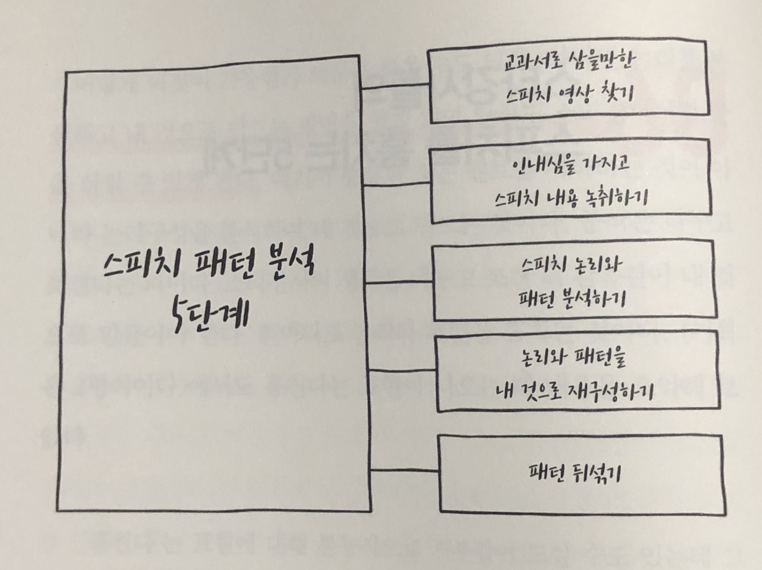 -> 여러 강사의 패턴을 분석하여 시작은 김창옥 교수처럼, 본론은 손석희 앵커처럼, 결론은 설민석 강사처럼 패턴을 뒤섞는 순간 나만의 새로운 스피치 스타일이 만들어진다.