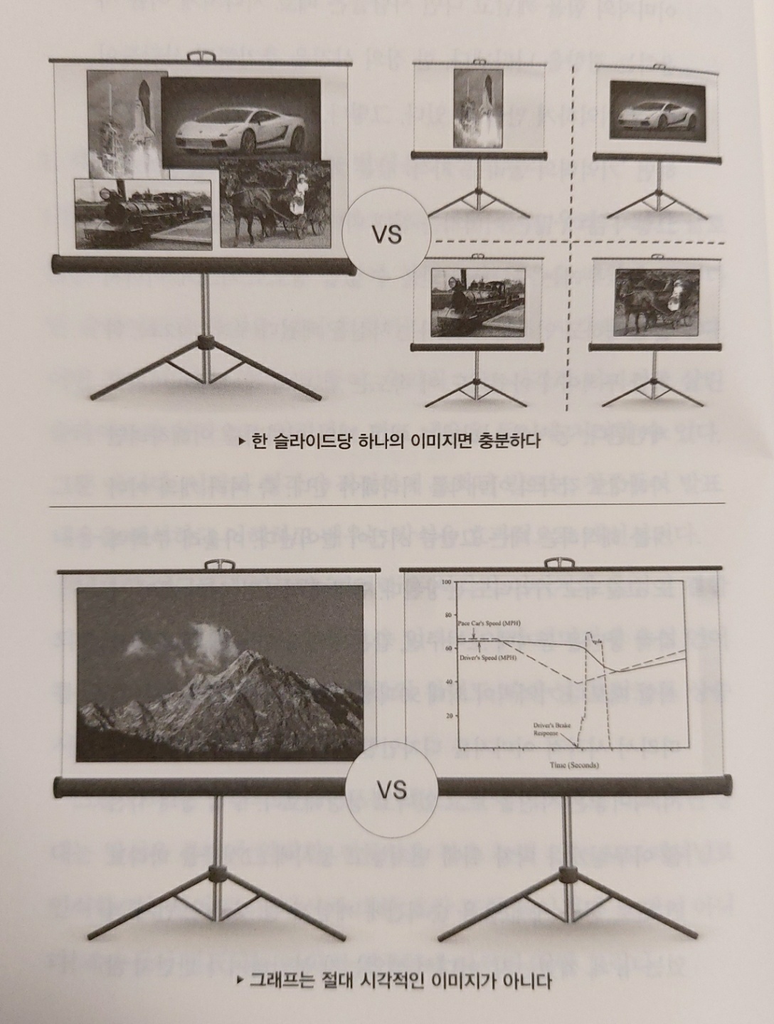 이미 잘 알고 있지만 이미지를 보면서 발표를 듣는 것은 학습효과와 기억력을 향상시킨다. 지난주 엑사 수업 피드백에서 PPT장표에 글씨가 너무 많다는 개선의견이 나왔다. 이미지는 한번에 하나씩만 보여줘야 하며, 주제와 관련 없는 이미지는 참여도를 촉진한다는 것을 기억하자. 그래프와 표는 이미지가 아니라는 것도 명심해야 한다.
