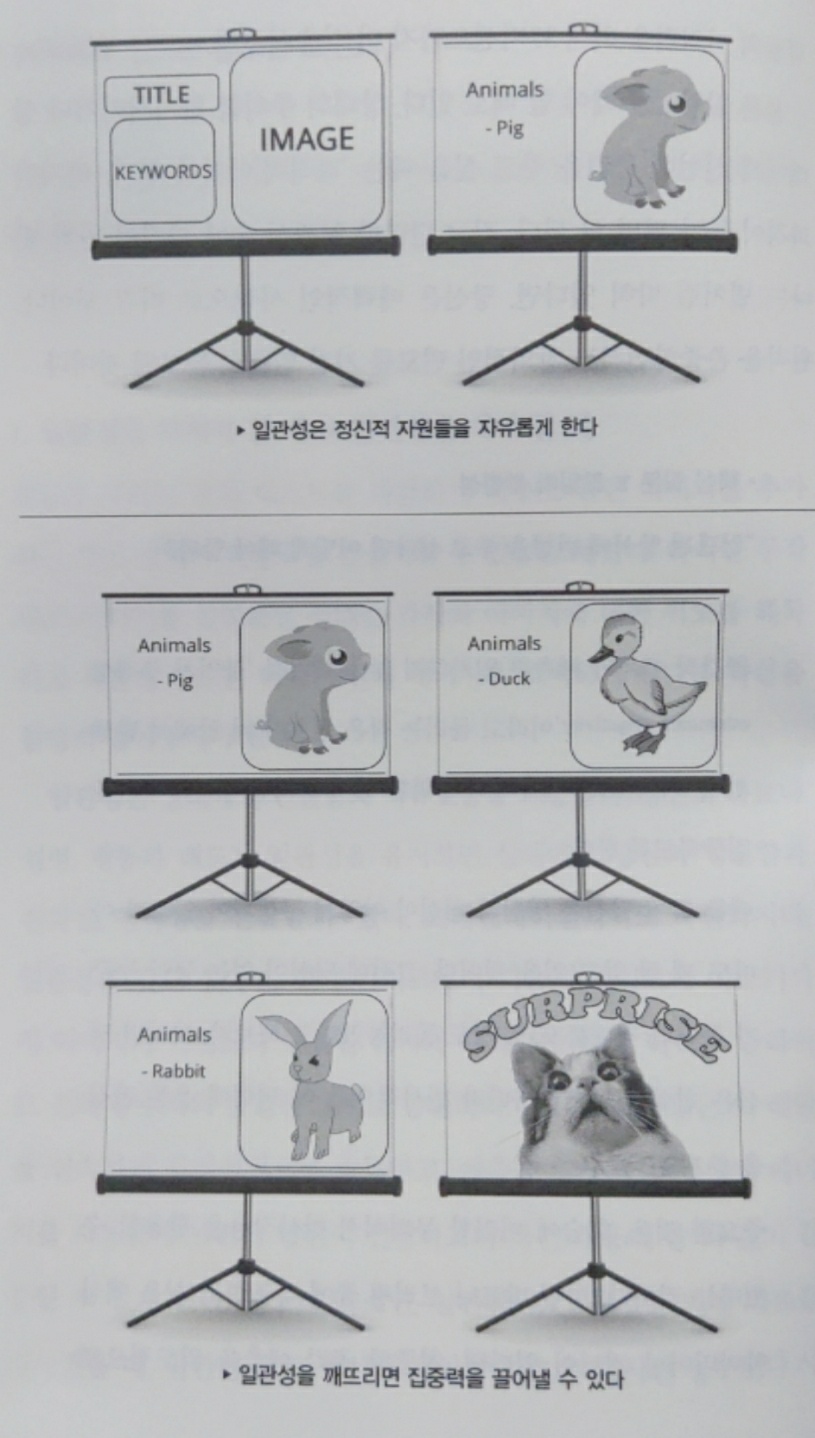 사람들을 익숙한 곳으로 데려가 일관성을 보여주다가, 특정 부분에서는 일관성을 깨야할 때도 있다. 일관성이 있으면 사람들은 35%나 기억력이 높아졌다고 한다. 맥락단서를 적극 활용하면 상대의 학습력과 기억력을 향상시킬 수 있다. 자료를 예측 가능한 형식으로 제작하는 것이 핵심이다. 파일을 오픈하면 커서가 항상 제일 첫 번째 위치에 존재해야 한다. 실제 회사에서도 엑셀 첨부파일을 보면 작성자가 얼마나 디테일에 강하고, 사용자 친화적인지 알 수 있다. 사용자가 불필요한 에너지를 사용하지 않도록 명심해야 한다.